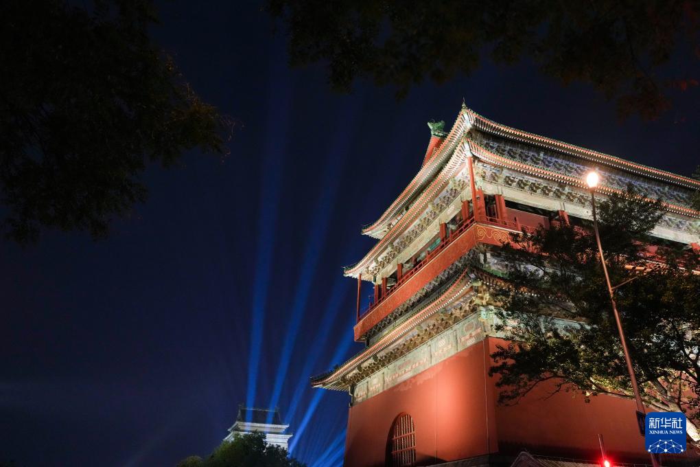 9月26日拍攝的完成景觀照明設(shè)施提升后亮燈的鼓樓和鐘樓。