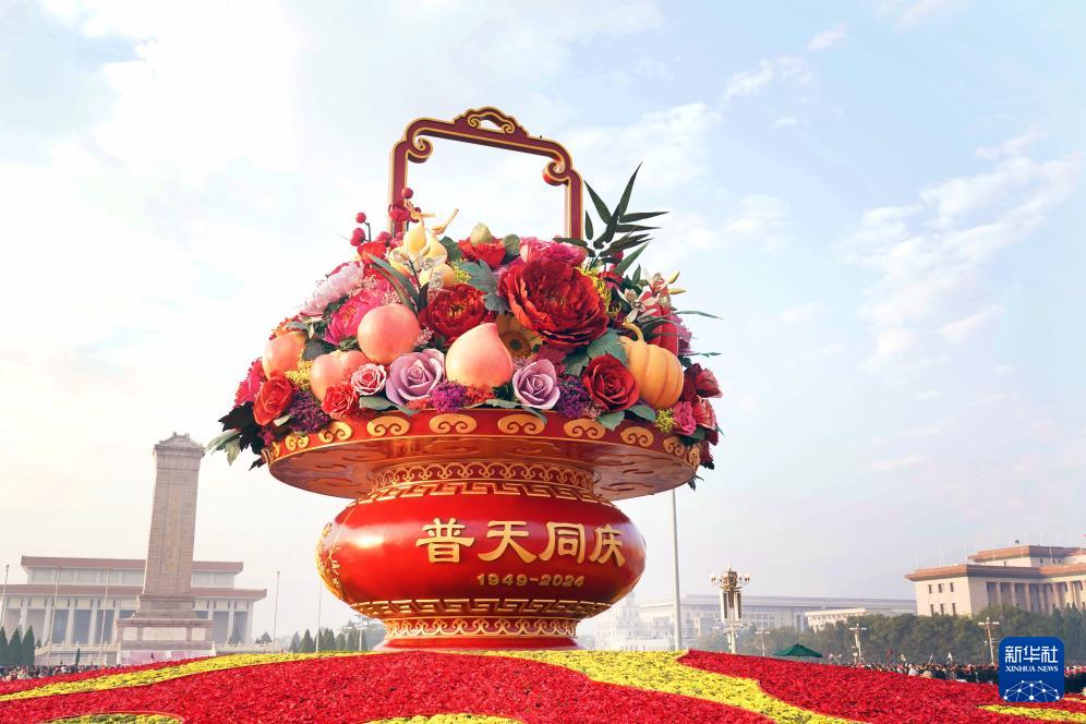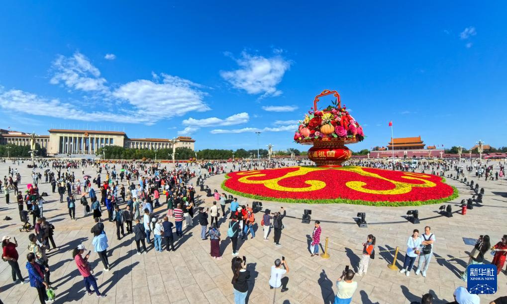 9月25日在天安門廣場拍攝的“祝福祖國”巨型花籃南側(cè)。