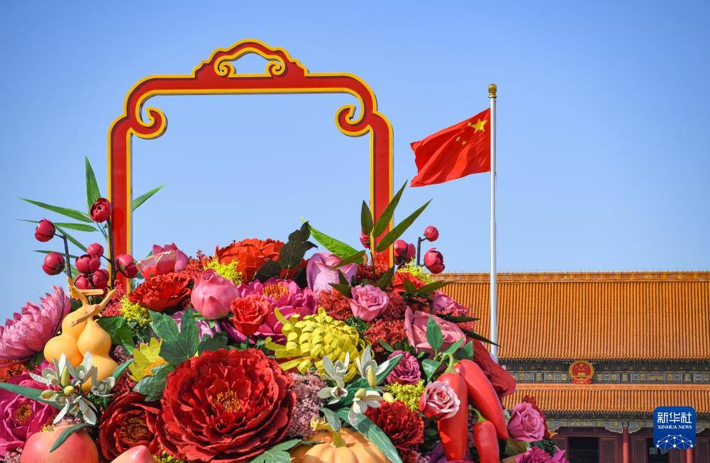 9月25日,五星紅旗在天安門廣場“祝福祖國”巨型花籃前飄揚。