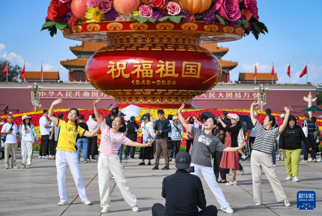 9月25日,人們在天安門廣場“祝福祖國”巨型花籃南側(cè)留影。