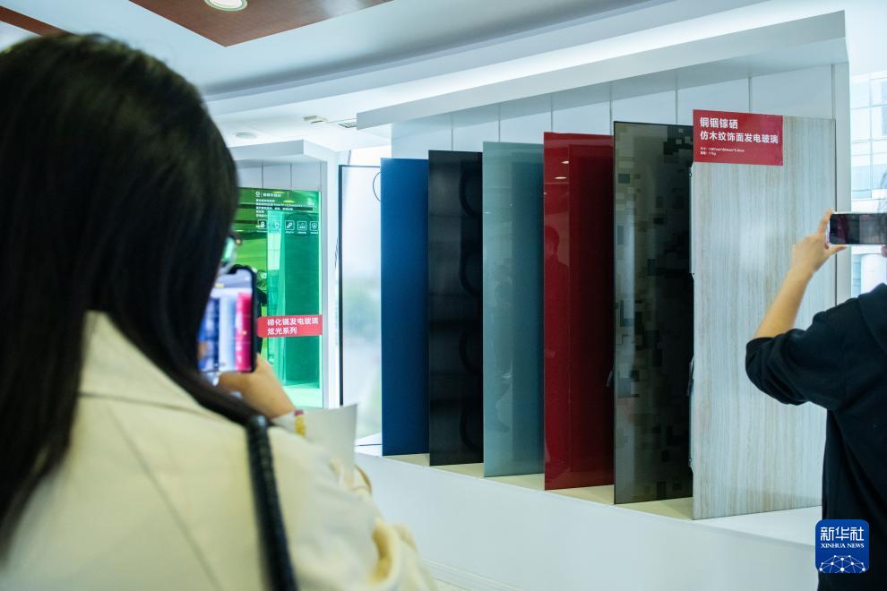 這是浮法玻璃新技術(shù)國家重點(diǎn)實(shí)驗(yàn)室內(nèi)展出的銅銦鎵硒仿木紋飾面發(fā)電玻璃等研發(fā)產(chǎn)品(11月8日攝)。