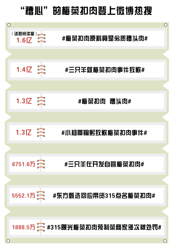 在引發(fā)行業(yè)震蕩后,該事件的影響從預制菜領域蔓延到直播帶貨領域,原因是東方甄選、主播“瘋狂小楊哥”以及其所屬的三只羊網(wǎng)絡科技有限公司均在直播間售賣過該產(chǎn)品。消息一出,輿論嘩然。對此,東方甄選、主播“瘋狂小楊哥”、三只羊網(wǎng)絡均作出回應并致歉。從相關微博話題來看,“#梅菜扣肉原料竟是糟頭肉#”“#三只羊就梅菜扣肉事件致歉#”“#小楊哥鞠躬致歉梅菜扣肉事件#”等話題閱讀量均超過1.3億,輿論聲量頗高。