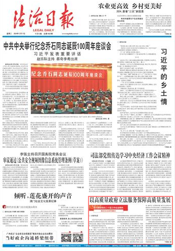 “法者,治之端也”。政府立法是法治政府建設(shè)的重要保障。我們要全面貫徹落實(shí)黨的二十大和二十屆二中、三中全會(huì)精神,完整準(zhǔn)確全面貫徹新發(fā)展理念,著眼于以良法促進(jìn)發(fā)展、保障善治,突出問題導(dǎo)向,堅(jiān)持干字當(dāng)頭,不斷提高政府立法質(zhì)量和效率,使政府立法更加“立得住”“行得通”“真管用”,推動(dòng)法治政府建設(shè)取得更大進(jìn)展,努力為高質(zhì)量發(fā)展創(chuàng)造既充滿活力又安定有序的法治環(huán)境。