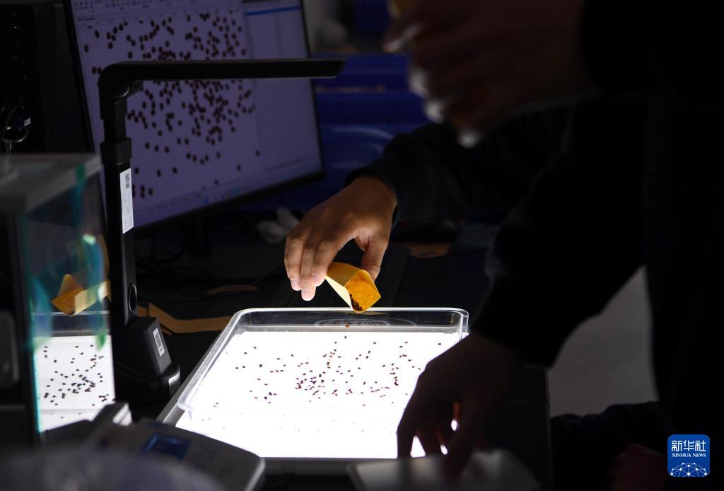 12月25日,在位于河南新鄉(xiāng)的中原農(nóng)谷實(shí)驗(yàn)室,中國農(nóng)科院中原研究中心科研人員在考種儀上分析高粱種子。