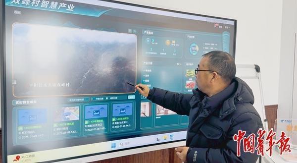 1月8日,雙峰村村支部書記陳家凱通過村里的智慧大屏查看村中的智慧產(chǎn)業(yè)。中青報·中青網(wǎng)見習(xí)記者 趙麗梅/攝