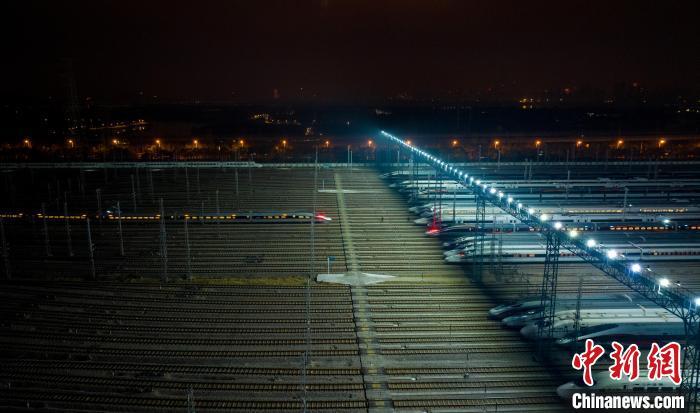 14日凌晨3時,在武漢動車段存車線上,百余組動車整齊排列,勢如“陸地航母”,即將啟航迎接回家的人們。(完)