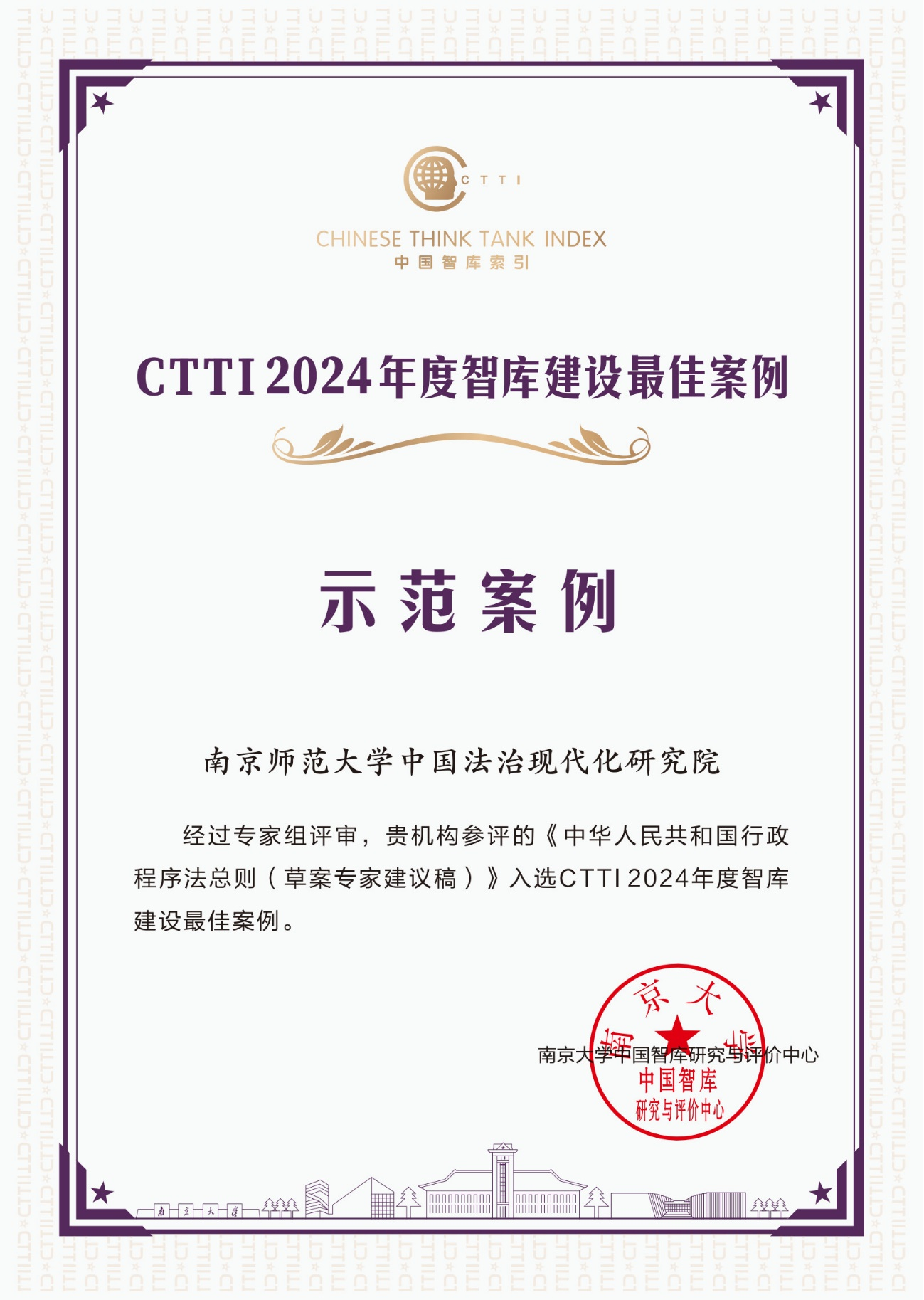 2024年12月7日,南京大學(xué)中國(guó)智庫(kù)研究與評(píng)價(jià)中心公布,南京師范大學(xué)中國(guó)法治現(xiàn)代化研究院的《中華人民共和國(guó)行政程序法總則(草案專(zhuān)家建議稿)》入選CTTI2024年度智庫(kù)建設(shè)最佳案例示范案例。