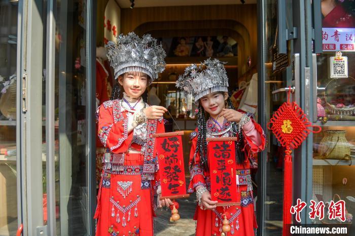 圖為小朋友身著民族服飾在福州羅源縣溪尾街歷史文化街區(qū)拍照打卡。劉其燚 攝