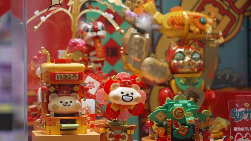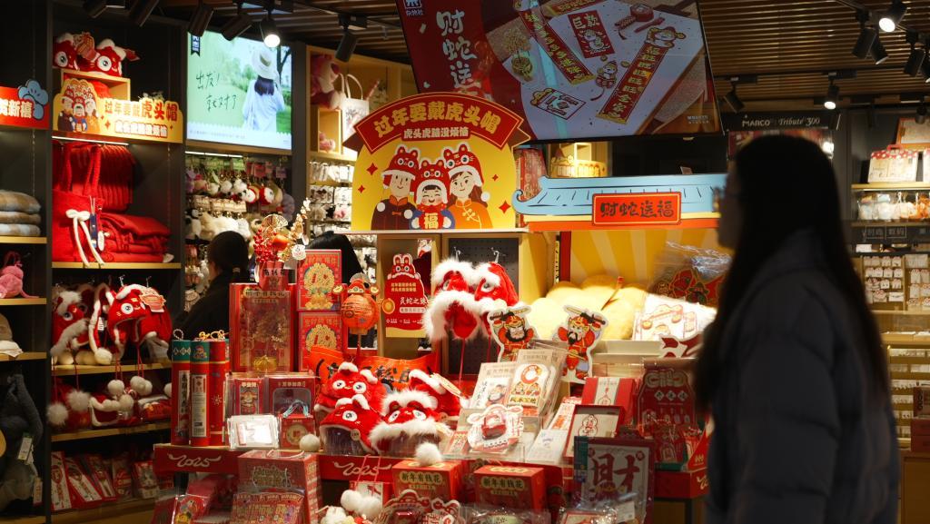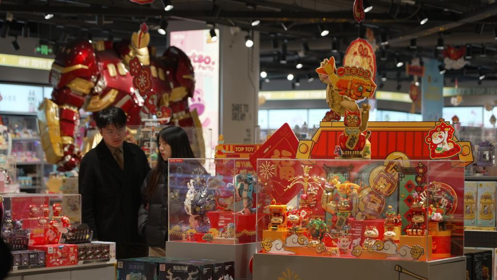 “閑來逛市場,年貨盡琳瑯?!背允呈悄晡?,裝飾是彩頭,年貨市場紅紅火火。在江西南昌一商超內(nèi),購置年貨的消費者人頭攢動。不遠處一家潮玩店也是門庭若市,店內(nèi)潮流人偶戴上“財神帽”,顆粒拼裝的積木花蕊在枝頭綻放,舞獅、錦鯉、招財貓等節(jié)日“使者”穩(wěn)居C位……