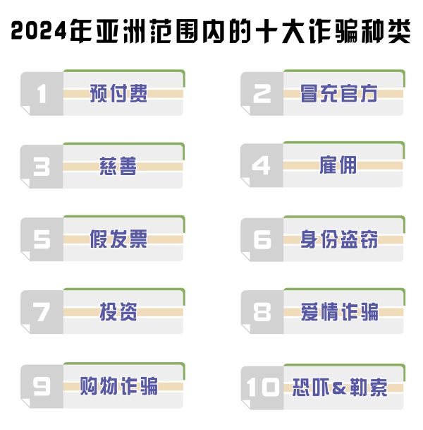根據(jù)《2024年亞洲詐騙報告》,統(tǒng)計2024年亞洲范圍內(nèi)13個國家及地區(qū)詐騙種類前三名,計算后得出,身份盜竊、投資詐騙、購物詐騙成為出現(xiàn)頻率最高的詐騙類型,占比均為23.08%。此外,冒充官方、政府機關(guān)人員實施詐騙占比達到10.26%,同樣需要引起重視。