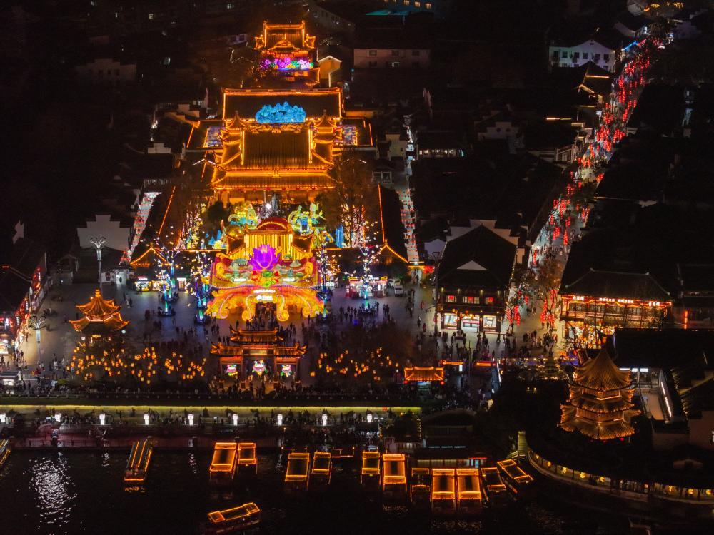 這是1月21日在江蘇南京夫子廟展區(qū)拍攝的燈組(無人機照片)。新華社記者 李博 攝