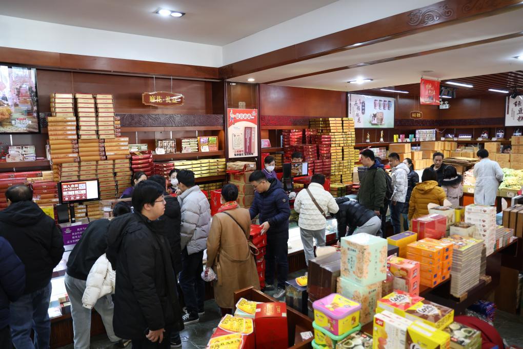臨近除夕,天津桂發(fā)祥十八街麻花旗艦店內(nèi)人頭攢動(dòng),以麻花為主的年貨商品包裝精美、琳瑯滿目,多個(gè)收銀臺(tái)前叫單不斷、排起長隊(duì)。