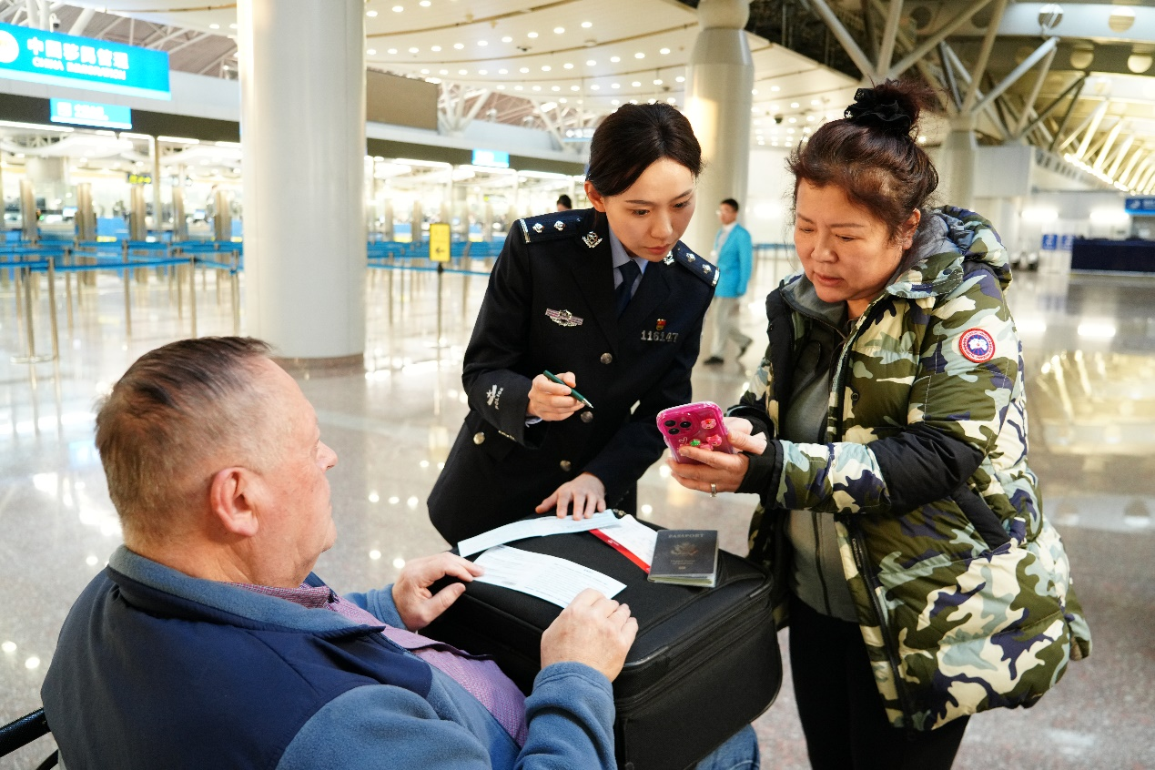 來自北京邊檢總站執(zhí)勤六大隊的杜希銘,早早站在“特別通道”前等待旅客們的到來?!疤貏e通道”是專門為老人、兒童、殘障人士等設(shè)置,方便他們更快捷地通過??吹揭患胰送浦鴥和囎叩饺刖硻z查點,杜希銘連忙走上前去,微笑著指引著他們走“特別通道”通過。