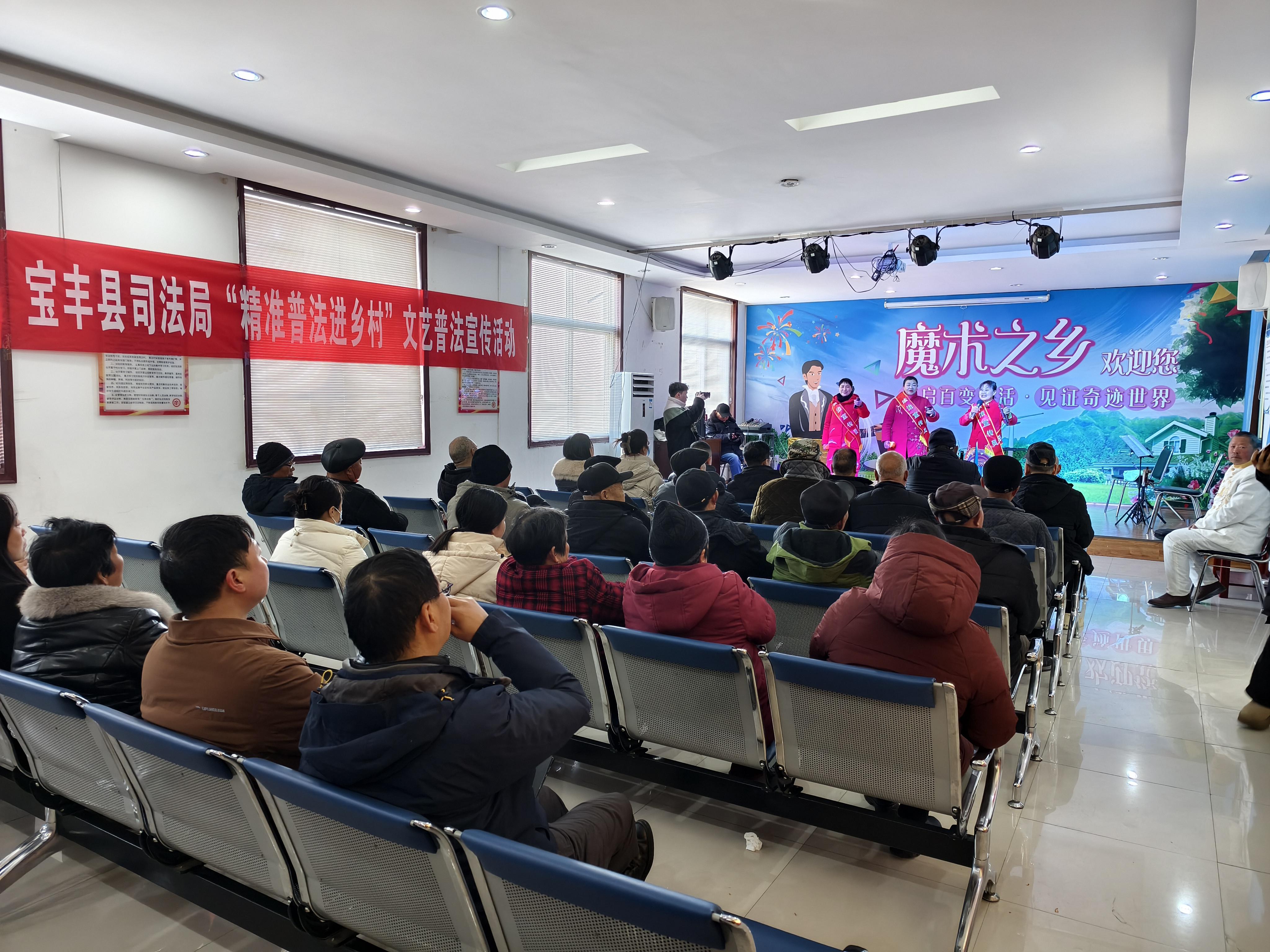 站在多功能教室門口,東邊靠墻設置成一個寬約5米、進深約3米、高約0.2米的小舞臺,舞臺背景墻“魔術之鄉(xiāng)”四個大字格外醒目。其他空間擺放著8排椅子,每排8個位子,基本上坐滿了村民。背面墻上掛著一條紅色橫幅——寶豐縣司法局“精準普法進鄉(xiāng)村”文藝普法宣傳活動。