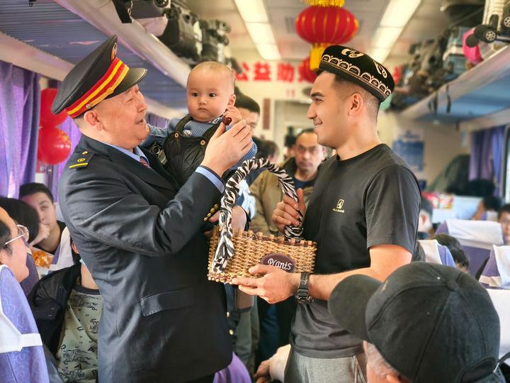 “列車巴扎開市啦!”1月25日早9點(diǎn),祖國大西北,7558次“和田玉龍?zhí)枴绷熊囬_出新疆和田站。沒多久,12號(hào)車廂里就傳來列車長坡拉提汗的吆喝聲。車廂里立馬熱鬧起來,售賣農(nóng)副產(chǎn)品的吆喝聲、旅客的笑聲和交談聲奏響了歡樂的旋律……