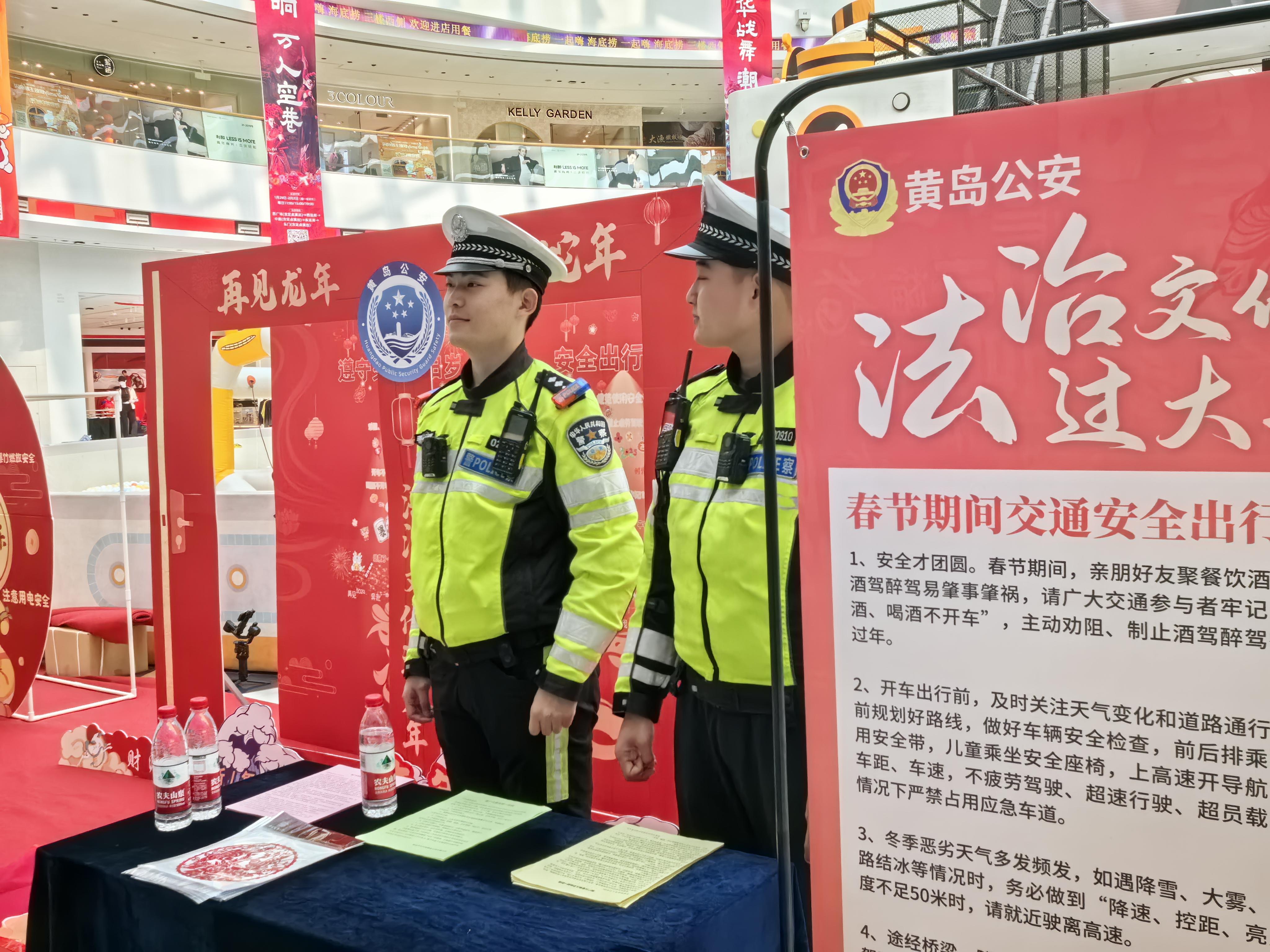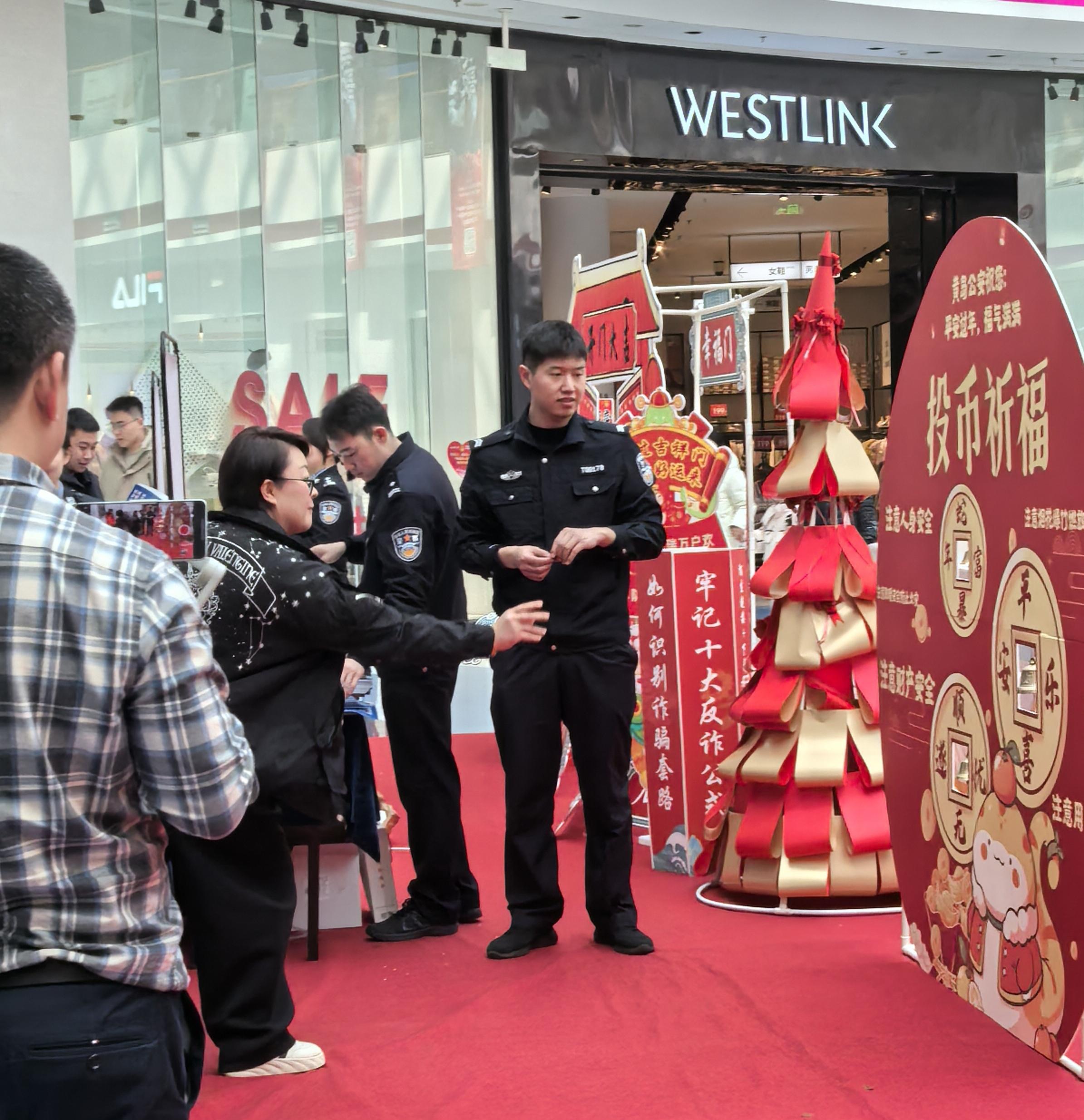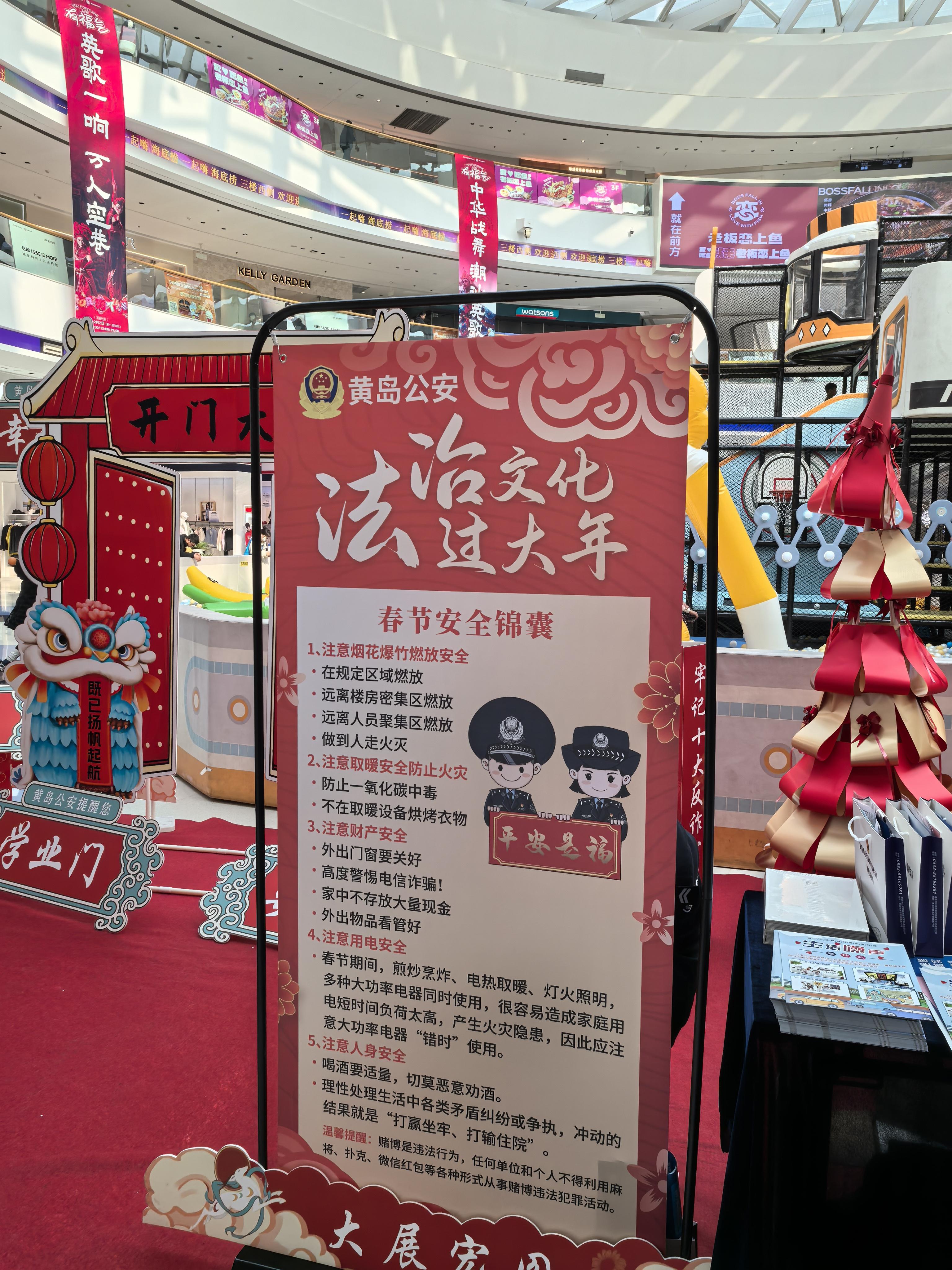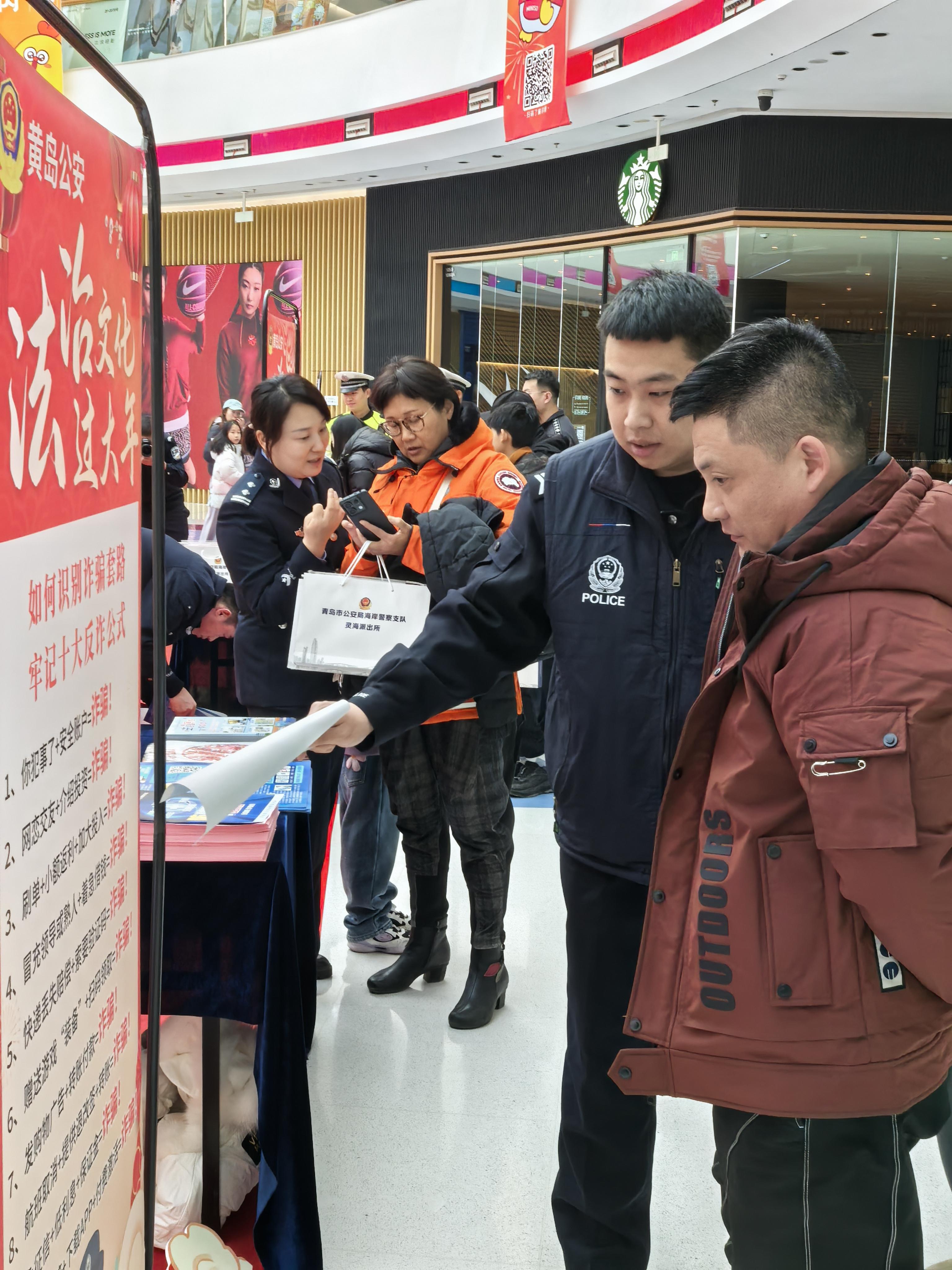 新春佳節(jié),山東省青島市黃島區(qū)某大型商場(chǎng)內(nèi)張燈結(jié)彩,人頭攢動(dòng),洋溢著濃濃的節(jié)日氛圍。在商場(chǎng)中央展廳,黃島公安組織的“法治文化過大年”宣傳活動(dòng)正如火如荼地進(jìn)行。