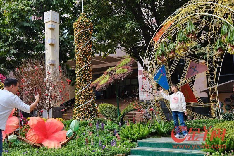 正門(mén)中軸線景組采用獨(dú)特的年桔扎作、年花扎作手法,打造年桔版“小蠻腰”廣州塔、香港中銀大廈、澳門(mén)大三巴牌坊等地標(biāo)以及采用矮牽?;ㄔ鞯暮鐦蛟煨途敖M。景組通過(guò)蛇管燈塑造輪廓,達(dá)到“花燈共賞”的效果。