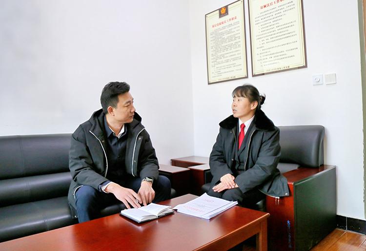 圖為記者向茹少男(右)了解大荔縣人民法院多元解紛機制。 本報通訊員 王瑞格 攝