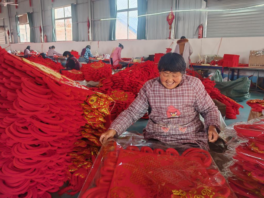 新華社鄭州2月8日電(記者吳剛)春節(jié)假期剛過(guò),河南省鄧州市陶營(yíng)鎮(zhèn)王良村的工廠車(chē)間里已是一派繁忙景象。62歲的村民胡選霞手指翻飛,一根紅繩在她掌心穿梭,不到3分鐘便編出一枚精巧的中國(guó)結(jié)。這樣的手工結(jié),她每天能完成200多個(gè),月收入超3500元,“比俺種幾畝地掙得多哩!”
