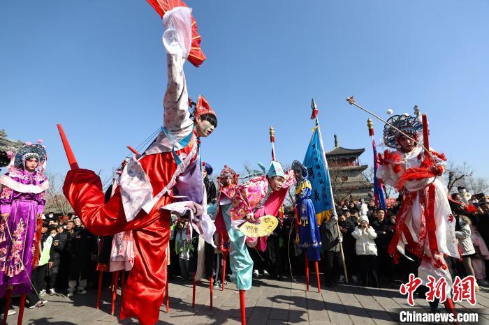 圖為2月9日,霸州市勝芳古鎮(zhèn)花會(huì)活動(dòng)現(xiàn)場,同義高蹺老會(huì)帶來精彩表演。賈珺 攝