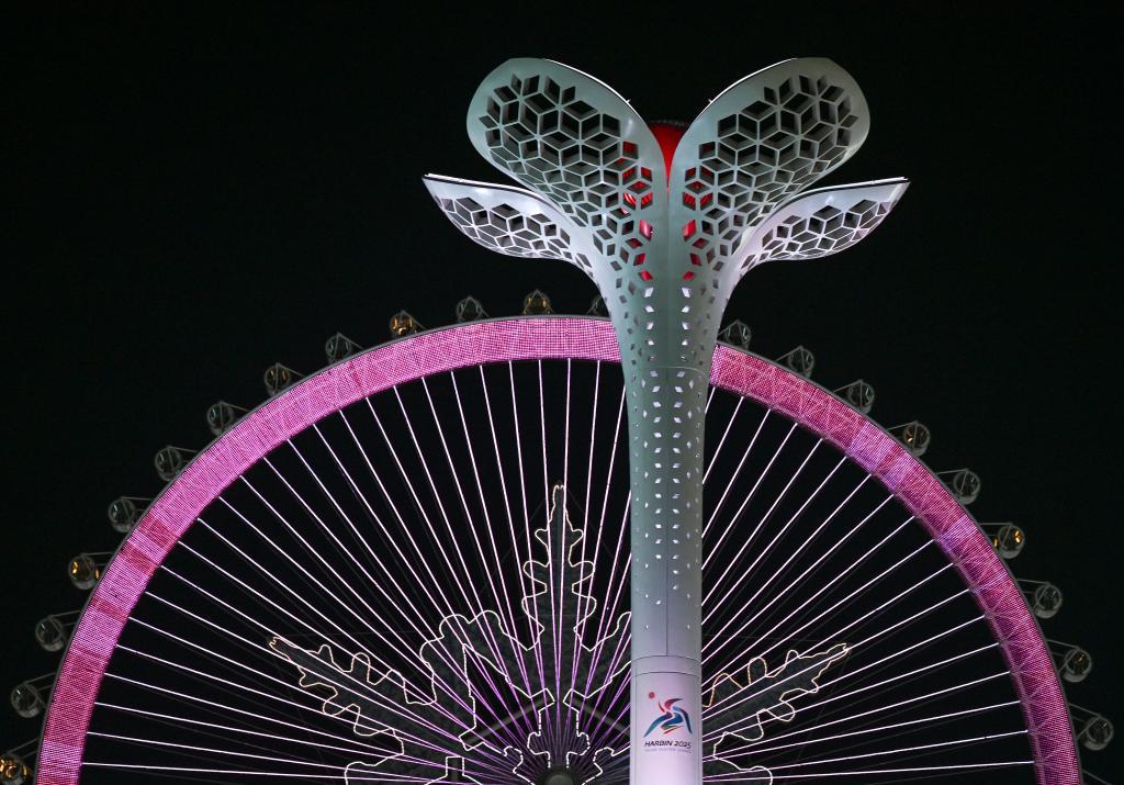當(dāng)喧囂的賽場(chǎng)漸漸沉寂,當(dāng)忙碌的身影停下腳步,開(kāi)幕式上的巨型冰燈返場(chǎng),鏡頭來(lái)到分會(huì)場(chǎng)。夜空之下,冰雪大世界里,雪花摩天輪前,亞冬圣火緩緩熄滅,絢麗燈光灼灼其華。