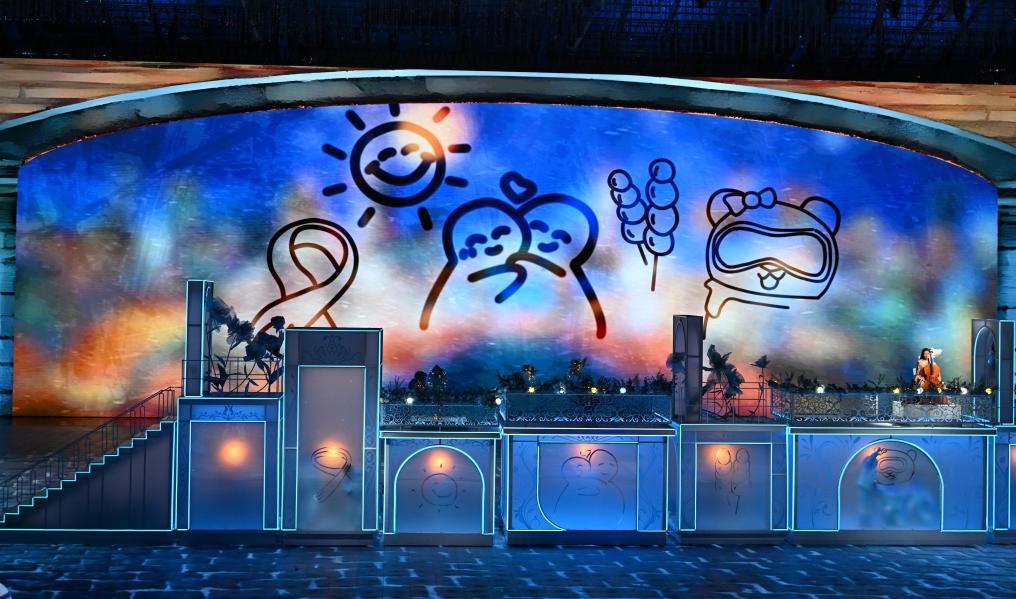 舞臺(tái)上,當(dāng)現(xiàn)場(chǎng)舞者與虛擬樂(lè)團(tuán)交相呼應(yīng),閉幕式演出震撼開(kāi)場(chǎng)。身穿橘黃紗裙的舞者翩然,宛如冰凌花朵朵綻放??蓯?ài)的“雪人”舞動(dòng)全場(chǎng),仿佛雪山的精靈帶來(lái)捷報(bào)。