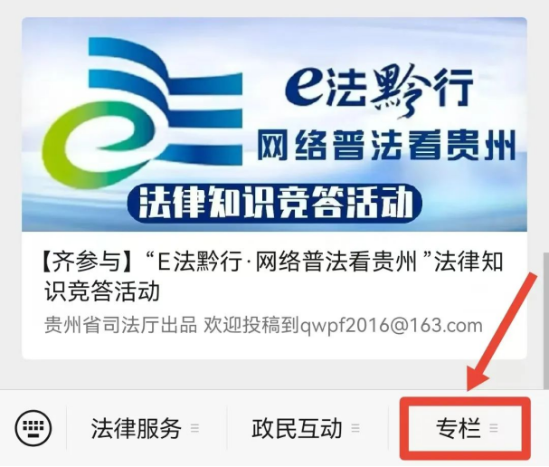 也可以進入“貴州司法”微信公眾號,點擊下方菜單欄“專欄”---“競答活動”。