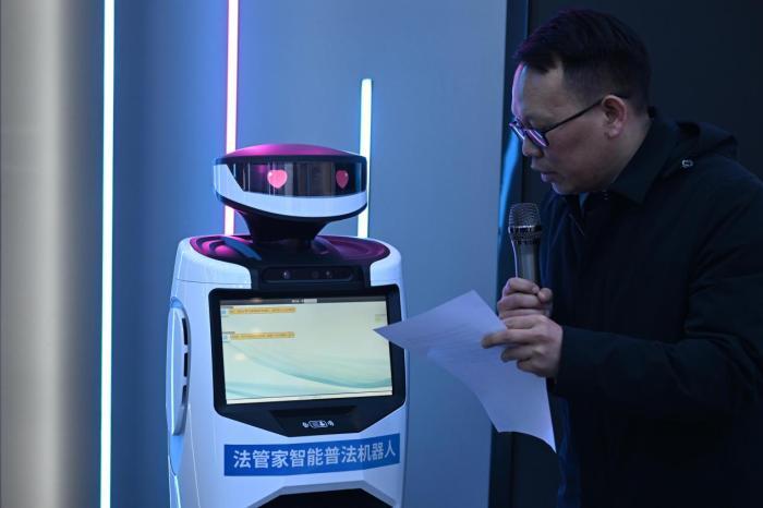 工作人員在演示“法管家智能普法機(jī)器人”的工作情景。中新網(wǎng)記者 李駿 攝