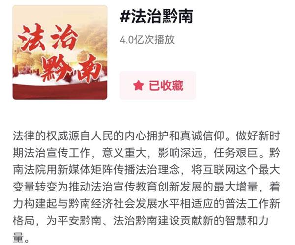 “網(wǎng)言網(wǎng)語”,提升品牌效應(yīng)。黔南中院積極擦亮“法治黔南”普法品牌,制作發(fā)布以案釋法、違法犯罪警示等短視頻作品,抓住和深耕社會熱點(diǎn),主動“傍”熱點(diǎn)普法,讓網(wǎng)民愿聽、想聽,滿足受眾的“信息需求”。截至目前,“法治黔南”短視頻普法話題在抖音平臺播放量超4億次。數(shù)字的背后,是一條條普法視頻從“圈內(nèi)”走向“圈外”,是一次次在“出圈破圈”中“吸粉引流”。