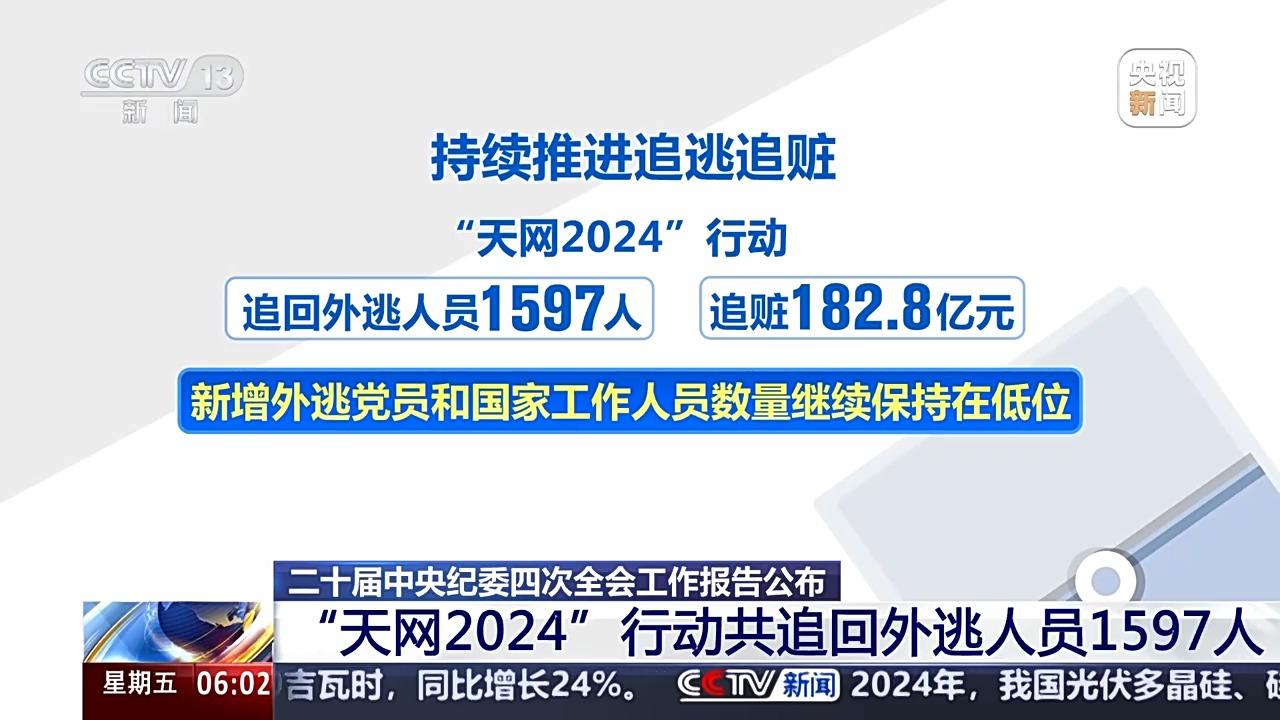 境內(nèi)打“虎”拍“蠅”,境外獵狐不停,紀檢監(jiān)察機關(guān)開展境外腐敗問題專項治理,立案查處跨境腐敗案件360件,挽回損失322億元;持續(xù)推進追逃追贓,“天網(wǎng)2024”行動共追回外逃人員1597人,追贓182.8億元,新增外逃黨員和國家工作人員數(shù)量繼續(xù)保持在低位。