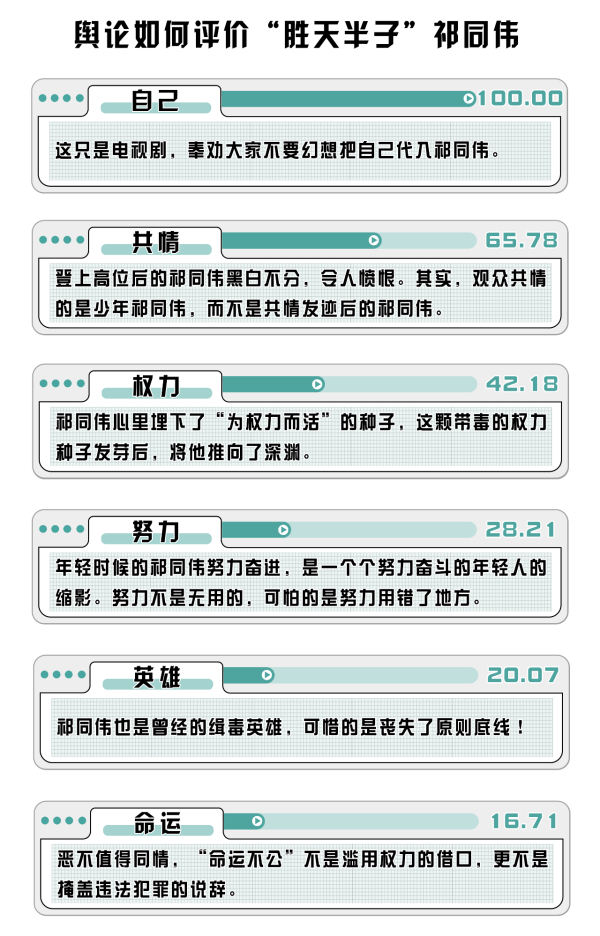 分析輿論發(fā)現(xiàn),身居高位的祁同偉濫用權(quán)力、違法亂紀,令人不齒,但年少時期的祁同偉引發(fā)觀眾共情。他通過自身努力考入心儀的大學(xué),更是在參加工作后扎根一線,成為緝毒英雄。但隨著劇情的深入,祁同偉的心態(tài)發(fā)生改變,對權(quán)力的過度追求推他墜入深淵。有網(wǎng)民評論稱,祁同偉一定程度上代表了奮斗的普通人們,但他選擇了一條不歸路,也就此葬送了自己的命運;也有網(wǎng)民呼吁大家理性觀劇,不要將劇中的人物、情節(jié)過度代入到自己身上,電視劇與現(xiàn)實是有差別的,遠離犯罪、遵紀守法才是正道。