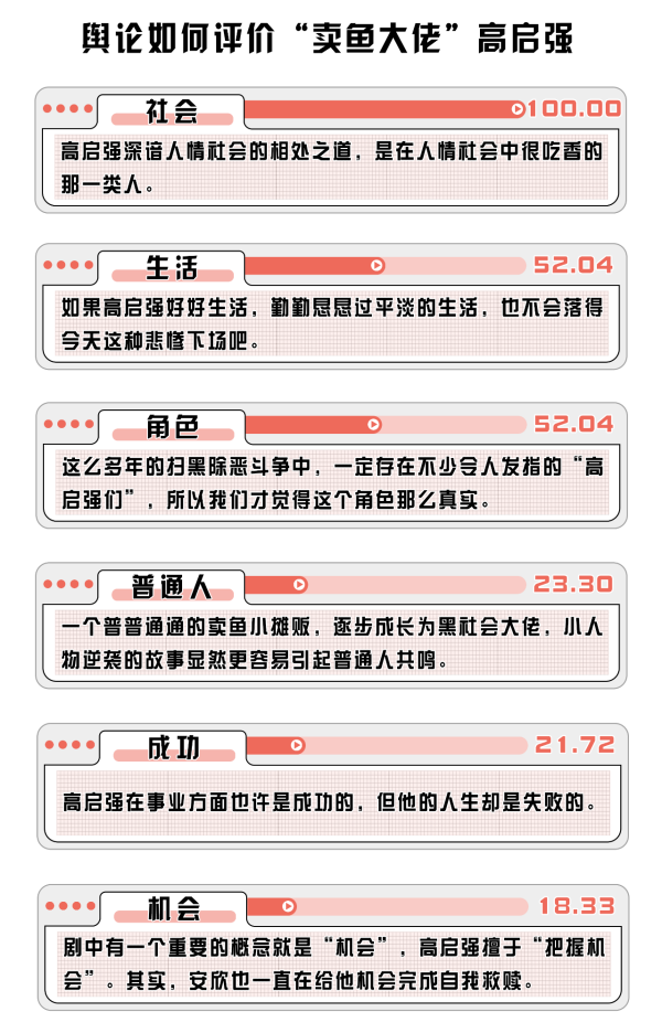 綜合輿論來看,有網(wǎng)民表示,掃黑除惡斗爭中,一定存在不少目無法紀的“高啟強”們,所以觀眾才會覺得這個角色如此真實,“高啟強”們作惡多端,理應(yīng)受到法律的制裁;有網(wǎng)民評論稱,在人情社會的大環(huán)境下,高啟強正是因為善于把握機會,才實現(xiàn)了身份轉(zhuǎn)變,但如果把犯罪作為通往成功的“登云梯”,那么結(jié)局一定是悲慘的;還有網(wǎng)民認為,高啟強的成功是“罪惡的成功”,其身上散發(fā)的魅力是“惡之魅力”,如果利用“小人物逆襲”的故事鼓吹反派角色的“悲情魅力”,則極易模糊正義與邪惡的界限。
