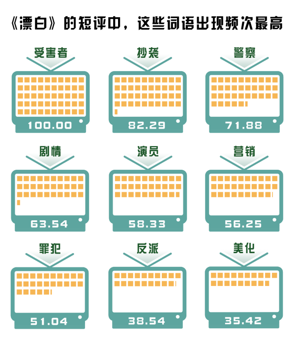 (制作:法治網(wǎng)輿情中心 數(shù)據(jù)來源:選取400條《漂白》豆瓣短評,對短評做分詞及歸一化處理,進行分詞后將熱度最高的詞語規(guī)定為100)