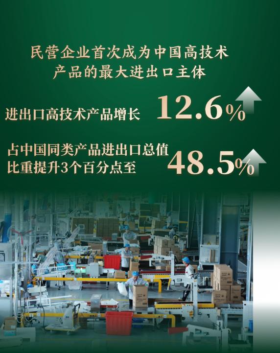 民營企業(yè)首次成為中國高技術(shù)產(chǎn)品的最大進出口主體,進出口高技術(shù)產(chǎn)品增長12.6%,占中國同類產(chǎn)品進出口總值比重提升3個百分點至48.5%。