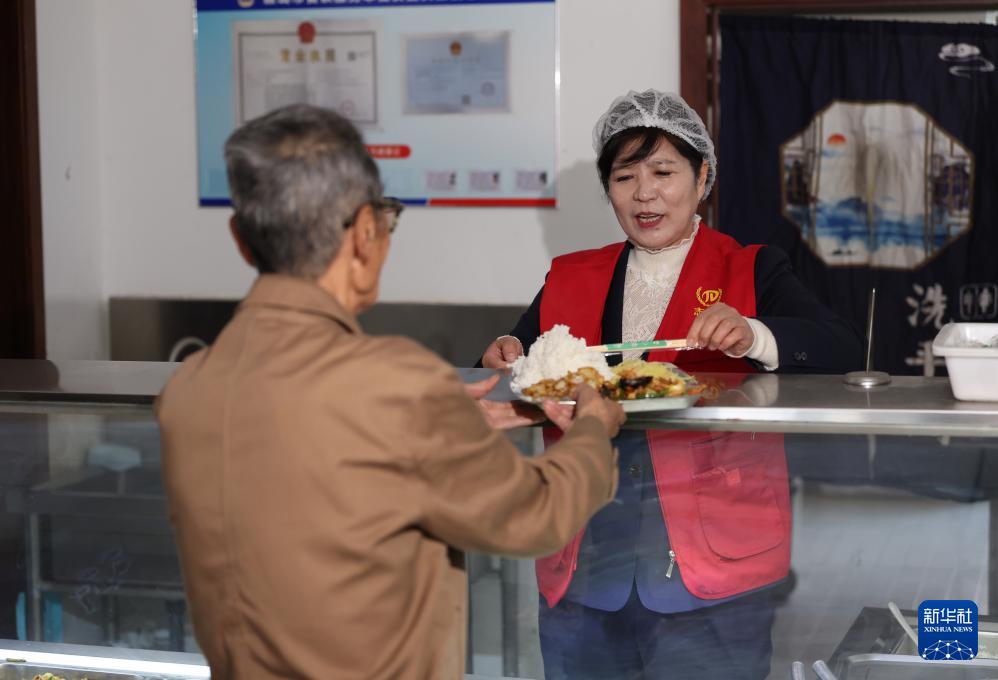 4月11日,馬鳳俠在福康社區(qū)“陽光食堂”給老人打飯。