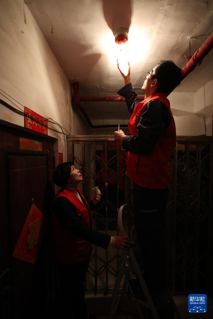 4月11日,在??瞪鐓^(qū)一樓道內(nèi),馬鳳俠(左)和志愿者在換燈泡。