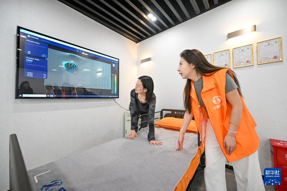 在天津小橙集團有限公司,工作人員展示一款安裝有傳感器的纖維床墊(4月18日攝)。該床墊可通過終端設備直觀查看床墊受力壓力數(shù)值,被應用于居家養(yǎng)老等服務場景。
