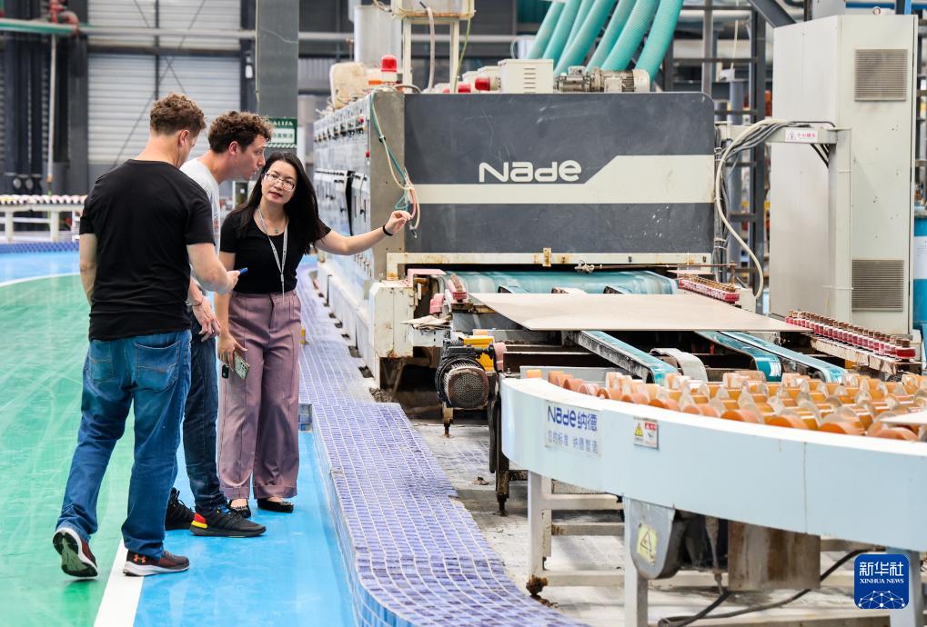 4月22日,兩名參加廣交會的阿根廷采購商專程來到佛山參觀蒙娜麗莎大尺寸陶瓷巖板自動生產(chǎn)線。