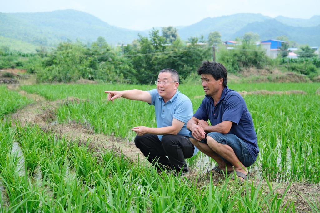 白竹村駐村第一書記莫日發(fā)(左)正在指導村民進行田間管理。新華社記者 鄒雨沁 攝