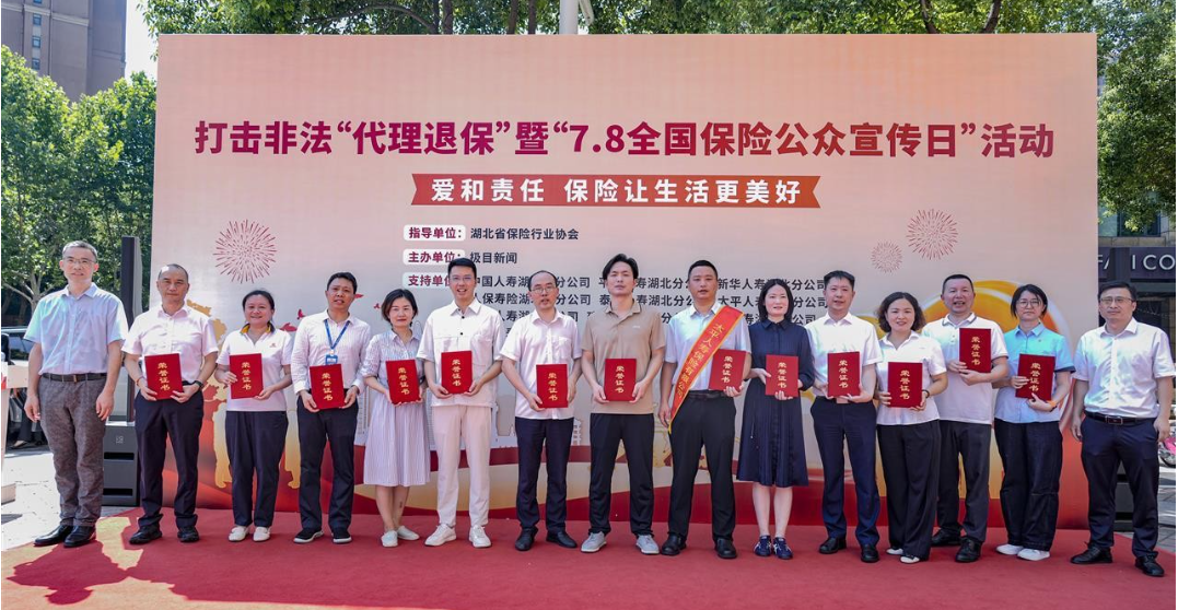 活動現(xiàn)場,大家人壽湖北分公司代表與12家金融機(jī)構(gòu)代表聯(lián)合發(fā)起倡議,鄭重宣讀《打擊非法代理退保承諾書》,展現(xiàn)行業(yè)堅(jiān)決打擊非法“代理退?!焙诨耶a(chǎn)的決心。國家金融監(jiān)督管理總局湖北監(jiān)管局、湖北省保險(xiǎn)行業(yè)協(xié)會和極目新聞相關(guān)領(lǐng)導(dǎo)共同為現(xiàn)場保險(xiǎn)公司頒發(fā)“打擊非法‘代理退?!蠕h單位”榮譽(yù)證書,倡議行業(yè)助力保險(xiǎn)消費(fèi)者守護(hù)好“錢袋子”。