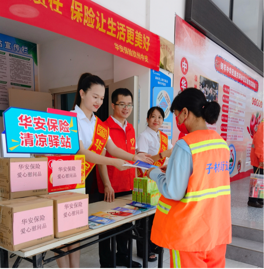 在廣西欽州白水塘社區(qū),華安保險的工作人員在開展“清涼驛站”活動慰問環(huán)衛(wèi)工人的同時,也向往來群眾開展防范非法金融活動宣傳;界首支公司在職場外設(shè)置了“清涼驛站”,連續(xù)多日為環(huán)衛(wèi)工人送上飲品、藥品和毛巾等防暑降溫物資;在湖北襄陽,工作人員前往襄州區(qū)西灣社區(qū)紅色驛站,把“清涼驛站”設(shè)在“紅色驛站”旁,一邊帶領(lǐng)員工開展紅色教育,一邊走進(jìn)社區(qū)開展保險宣傳,將紅色文化與保險互助理念相融合;在云南曲靖,華安保險的員工參觀紅軍博物館重溫入黨誓詞,并在三百戶營村廣場組織員工和村民開展長征精神與保險知識有獎問答活動;在合肥蜀山區(qū)大溪地商業(yè)廣場,華安保險以“納涼+公益咨詢”的創(chuàng)新形式開展宣傳,為往來客戶送去納涼神器同時,也把更多金融提醒向公眾進(jìn)行宣傳;7月7日下午,華安保險湖南分公司在長沙東方悅鄰商業(yè)廣場設(shè)立宣傳展臺,工作人員開展夏季用電安全知識有獎測試,并向過往市民普及保險知識、反欺詐技巧,同時為外賣和快遞小哥贈送消暑飲用水。