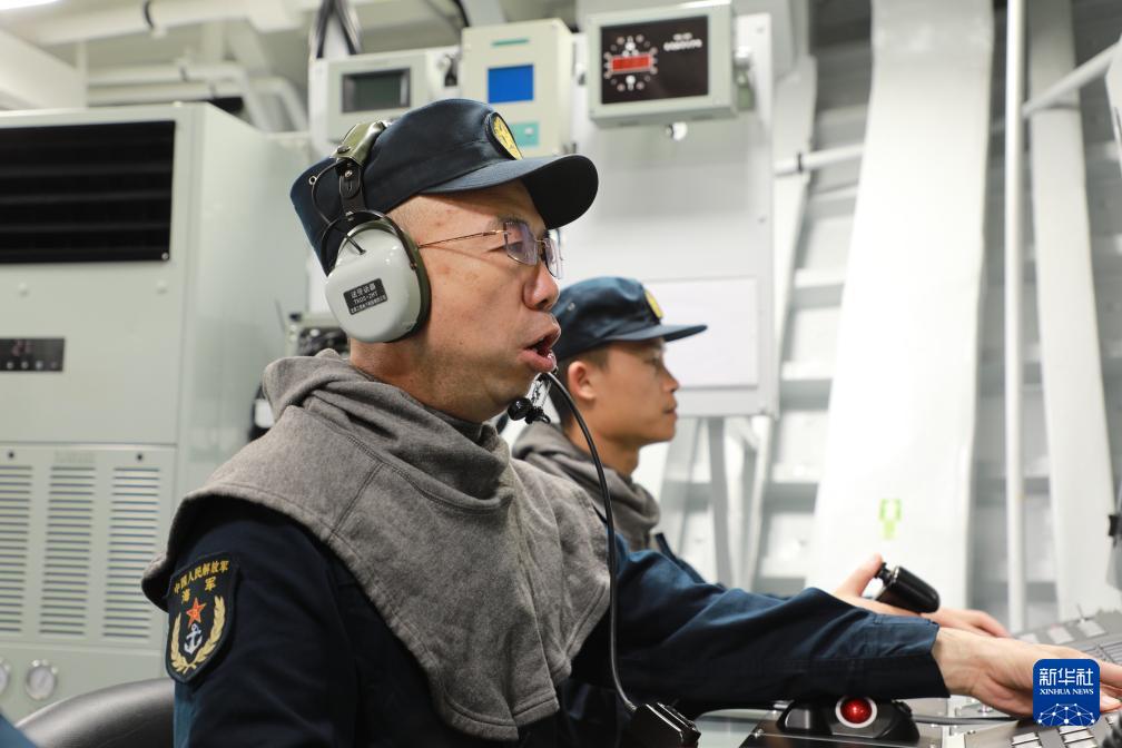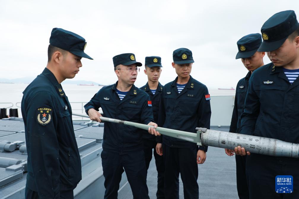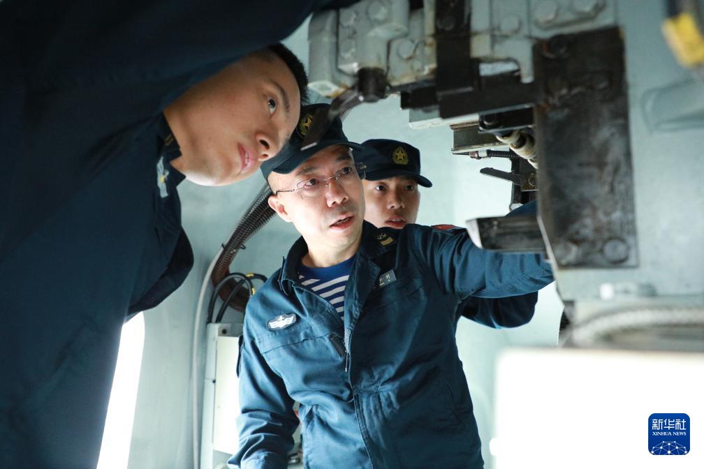 海軍資陽艦主炮區(qū)隊長馬少利(中)帶領(lǐng)戰(zhàn)友進行裝備檢視(6月11日攝)。新華社記者 李秉宣 攝