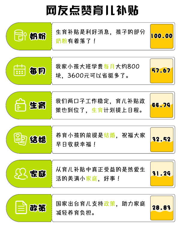 方案一經(jīng)發(fā)出,便迅速聚攏各方目光。“#發(fā)放育兒補貼#”“#育兒補貼制度實施方案發(fā)布#”相關(guān)微博話題,閱讀量均突破1.2億?!澳液⒆邮欠穹仙觐I(lǐng)要求”“您家孩子‘掙’到3600元了嗎”更成為了寶媽寶爸們?nèi)粘:训男聝?nèi)容。