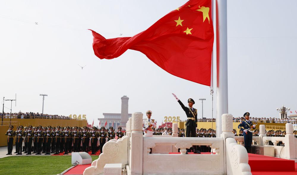 2025年9月3日,紀(jì)念中國(guó)人民抗日戰(zhàn)爭(zhēng)暨世界反法西斯戰(zhàn)爭(zhēng)勝利80周年大會(huì)在北京隆重舉行。這是天安門廣場(chǎng)舉行隆重的升國(guó)旗儀式。新華社記者 費(fèi)茂華 攝