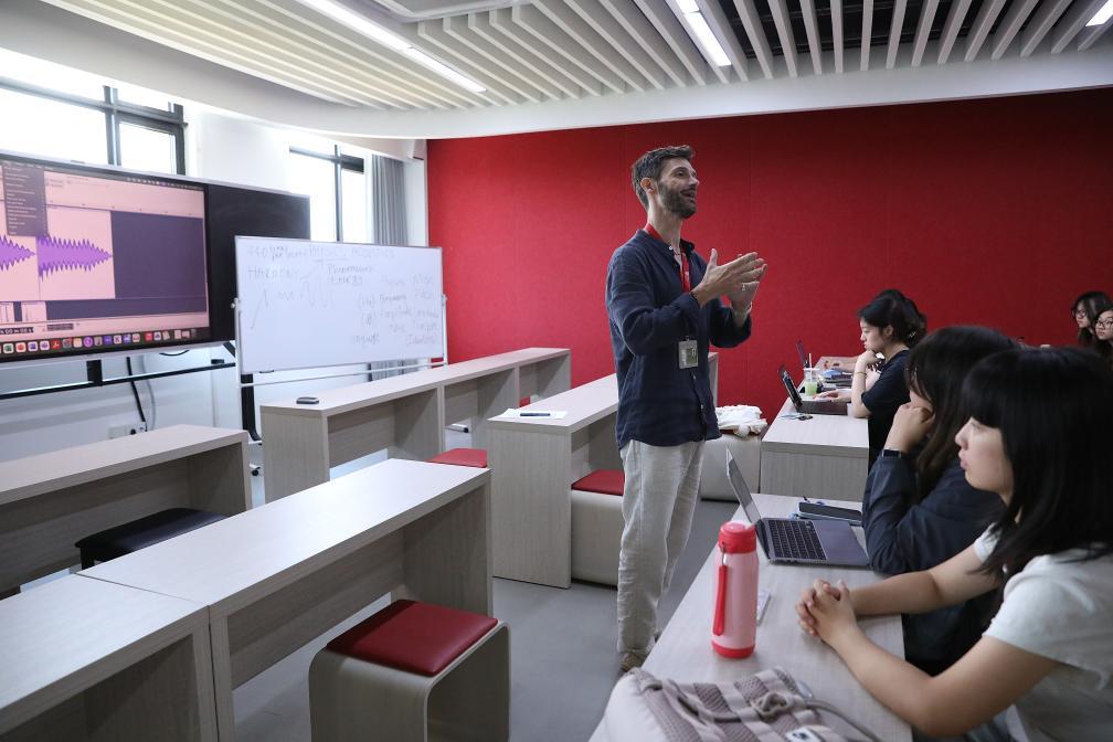 9月25日,海南陵水黎安國際教育創(chuàng)新試驗(yàn)區(qū)中央民族大學(xué)海南國際學(xué)院的外籍教師在給學(xué)生上音樂技術(shù)與作曲課。新華社記者 鄭悅 攝