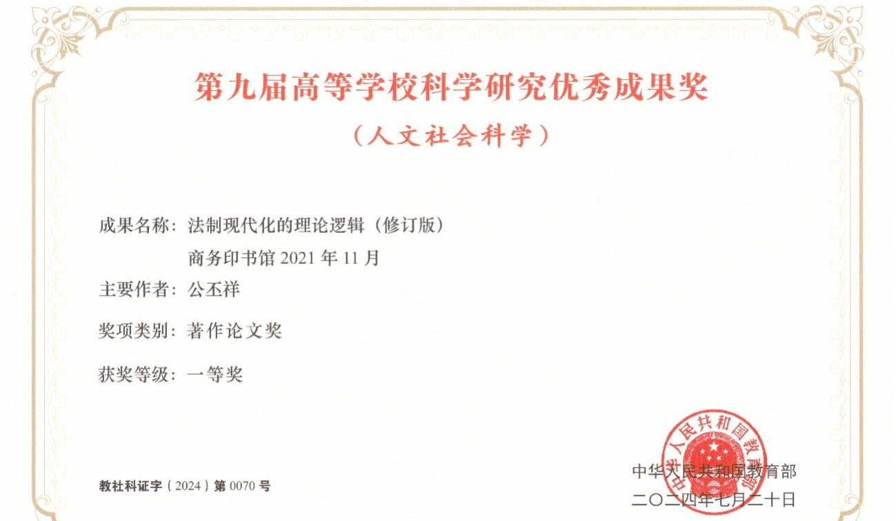 《法制現(xiàn)代化的理論邏輯(修訂版)》榮獲第九屆高等學(xué)校科學(xué)研究?jī)?yōu)秀成果獎(jiǎng)一等獎(jiǎng)