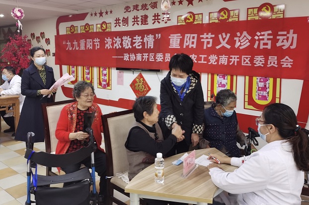 近日,天津市南開區(qū)政協(xié)與農(nóng)工黨南開區(qū)委會聯(lián)合開展“慶重陽、送健康”義診活動。醫(yī)療小組深入南開區(qū)養(yǎng)老中心,為在院老人進行義務(wù)診療咨詢,宣傳健康理念,講解用藥常識,以實際行動送上了節(jié)日祝福和溫暖關(guān)愛。 錢麗 李寧馨 攝
