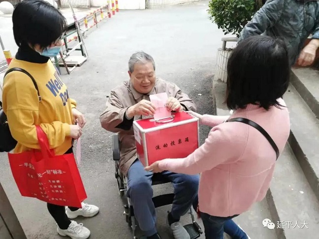 針對部分高齡老人、殘疾人等行動不便的選民,選舉工作人員捧著流動票箱走家串戶,方便選民投票。