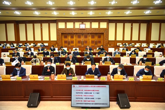 王良在主持時指出,習(xí)近平法治思想是順應(yīng)實現(xiàn)中華民族偉大復(fù)興時代要求應(yīng)運而生的重大理論創(chuàng)新成果,是馬克思主義法治理論中國化最新成果,是習(xí)近平新時代中國特色社會主義思想的重要組成部分,是全面依法治國的根本遵循和行動指南。要在深入學(xué)習(xí)貫徹習(xí)近平法治思想上下功夫求實效,與深入學(xué)習(xí)貫徹黨的十九屆六中全會精神結(jié)合起來,與深入學(xué)習(xí)貫徹習(xí)近平總書記關(guān)于堅持和完善人民代表大會制度的重要思想和中央人大工作會議精神結(jié)合起來,與深入學(xué)習(xí)貫徹習(xí)近平總書記對山東重要指示要求結(jié)合起來,與全面貫徹落實省委十一屆十四次全體會議精神結(jié)合起來,堅持黨對人大工作的全面領(lǐng)導(dǎo),不斷提高政治判斷力、政治領(lǐng)悟力、政治執(zhí)行力。要切實把學(xué)習(xí)成效轉(zhuǎn)化為做好人大工作的實際行動,在知行合一中擔(dān)當(dāng)作為,以強烈的責(zé)任感使命感扎實做好立法、監(jiān)督、普法宣傳等各項工作,努力為法治山東建設(shè)作出人大貢獻。