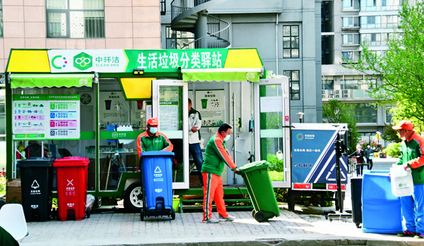 2021年4月17日,工作人員在北京市朝陽區(qū)望京街道金隅麗港城社區(qū)的生活垃圾分類驛站進行垃圾分類運送。攝影/新華社記者?李欣